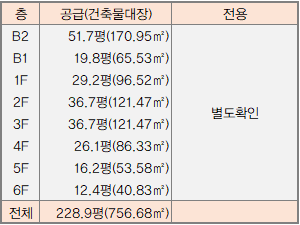 | 6층 | 사무소 | 제2종근린생활시설(사무소) | 40.83㎡ 12.35평 |
