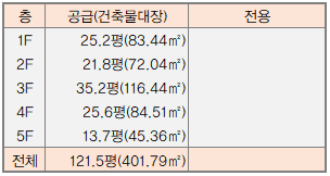 | 4층 | 사무소 | 제2종근린생활시설(사무소) | 84.51㎡ 25.56평 |