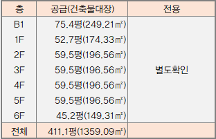 | 6층 | 사무소 | 업무시설(사무소) | 139.59㎡ 42.23평 |
