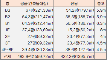 공급 1,599.72㎡ 484평 / 전용 1,395.7㎡ 422평 (전용률 87%) 평