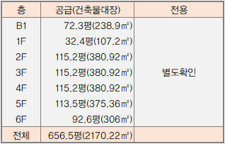 | 4층 | 기타제2종근린생활시설 | 학원,사무소 | 380.92㎡ 115.23평 |
